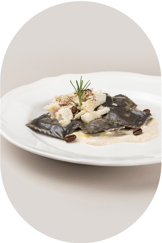Combine flour, water, egg, cuttlefish ink and add salt, knead until the mixture is smooth and homogeneous. Let the dough rest for 30min and take care of the coffee cream. Heat a knob of butter in a pan, add the cheese, the coffee and mix until you obtain a smooth and creamy consistency. Once melted, add salt. After 30 minutes roll out the dough and roll out the dough, add the burrata and prepare the ravioli. In a pan, blanch the cod for about 3 minutes, with a pinch of salt and a sprig of rosemary, once cooked, dry it with a cloth and bone it. Cook the ravioli and compose the dish with coffee cream, puffed cod and coffee powder.