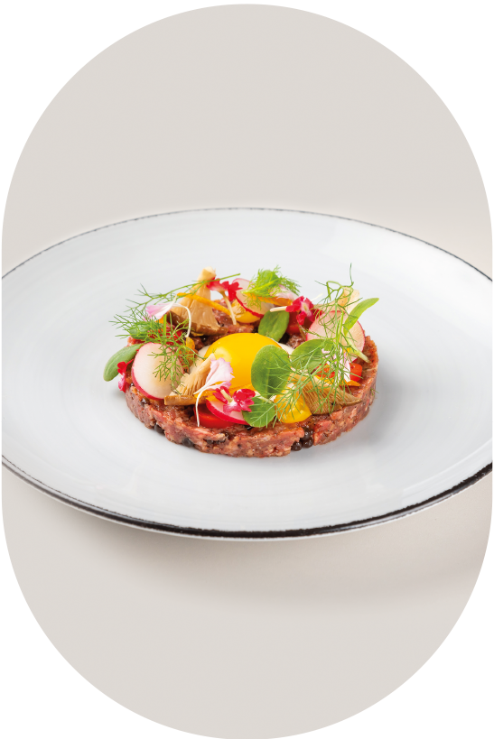 80 gr Carne magra di podolica; 3 gr Sambuca; 15 gr Sferificazione di caffè; 5 gr Senape; 5 gr Marmellata di peperoncino calabrese; 8 gr Caffè in polvere; 25 gr Burrata; 1 Tuorlo d’uovo; Sale, Pepe e Olio q.b.; Per la sferificazione al caffé: 10 gr Agar agar; 5 gr Zucchero; Olio di semi; 2 tazze di caffè Per le verdure di stagione: 5 gr Cardoncelli; 5 gr Pomodorini gialli; 5 gr Pomodorini rossi; 5 gr Ravanello; 5 gr Fiori eduli; Barbe di finocchio q.b.PREPARAZIONE